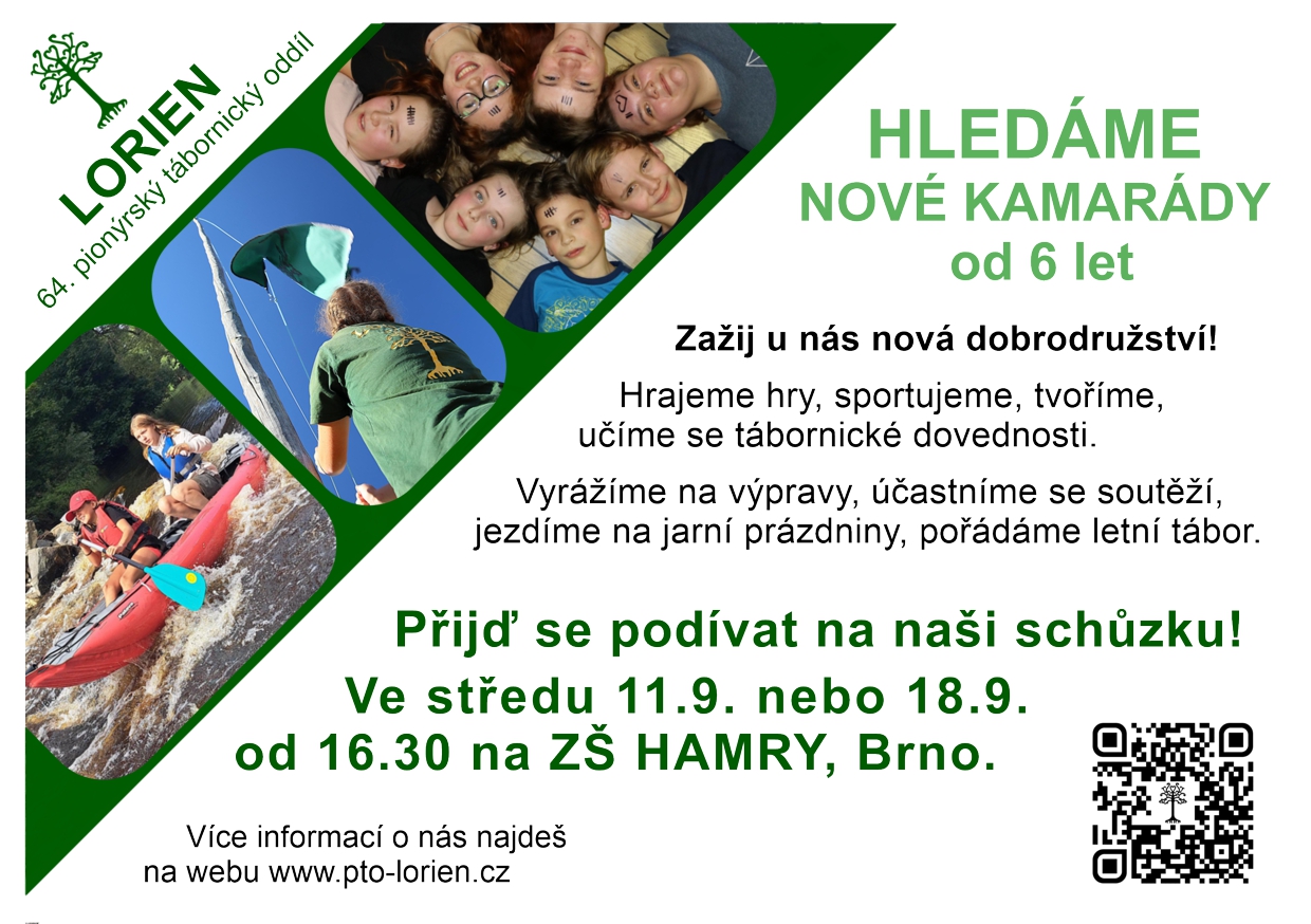 Ještě vznikne družinka z nováčků, kde se budeme dětem věnovat úplně od začátku, aby se naučili vše, co budou potřebovat na výpravy do přírody. Sraz je před ZŠ Hamry (hlavní vchod z ulice Hamry). Děti vybavte do batůžku pitím, přezůvkami, psacími potřebami, sešitem A5 a oblečením na ven (budeme se snažit co nejvíce času trávit venku, v případě škaredého počasí půjdeme dovnitř). Čeká nás celoroční hra, která je prozatím zahalena tajemstvím. Dozvíte se ji na prvních schůzkách.