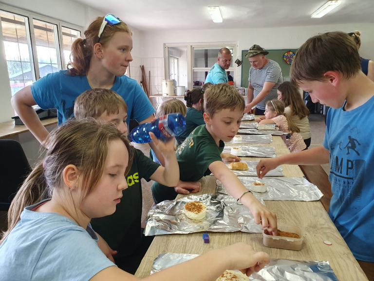 Vše nabalte do batohu na záda, děti půjdou z nádraží na chatu cca 2 km pěšky (pití, svačina a čelovka po ruce). Karimatka a spacák můžou jet autem (plyšáka, polštáře a podobné věci sbalte do batohu). Přihlášku a peníze doneste na sraz.