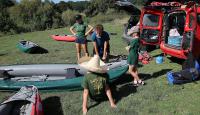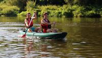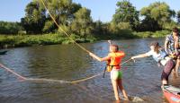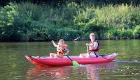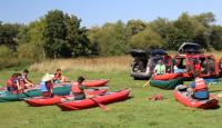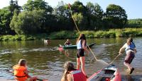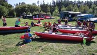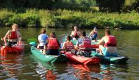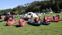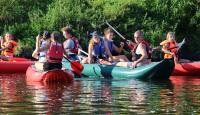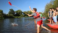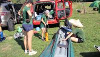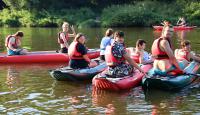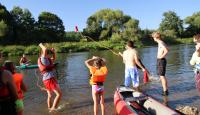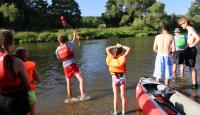 Protože v Lužnici bylo vody hodně pod limitem na splutí, padlo rozhodnutí na Berounku. První den jsme rozložili základní tábor v kempu U Dolanského mostu 124,9 ř.km, nedaleko Plzně. Volnou chvíli jsme se učili správnou techniku pádlování a ovládání lodě na pozici háčka i kormidelníka. Také jsme si všichni zkusili použití "házečky". Nejdříve na suchu a následně i na vodě u kempu. Ovládání lodě - super. Házečka …. doufám, že ji nebudeme potřebovat. Došlo také na první vodní bitvu.